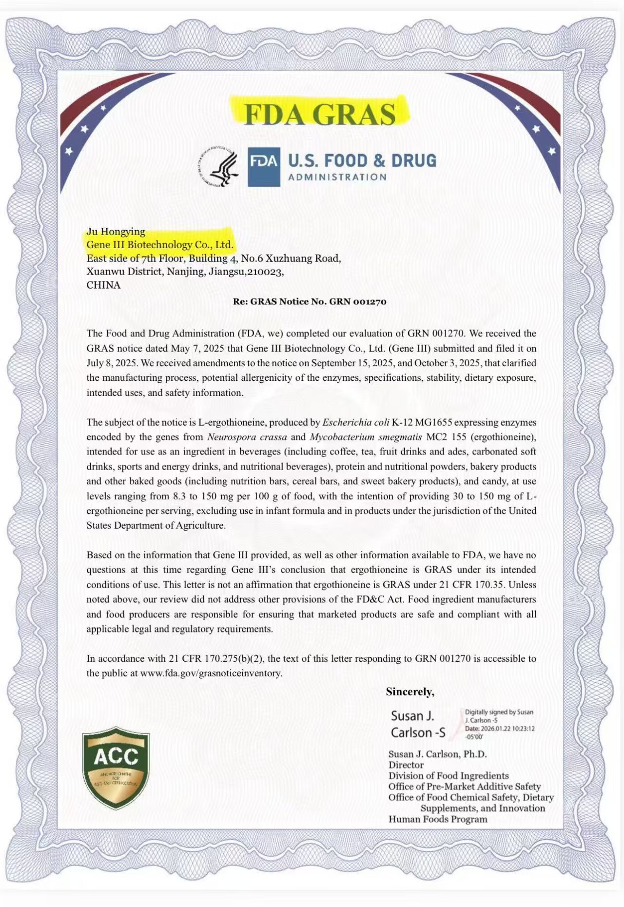 FDA GRAS证书编号:GRN 001270; WWW. FDA.GOV官网可查。