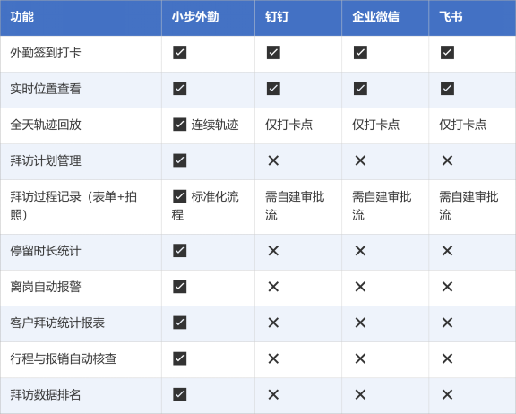 钉钉、企业微信、飞书是优秀的办公协同平台,但它们的外勤功能只是"附属品"——能打卡、能看位置,仅此而已。
