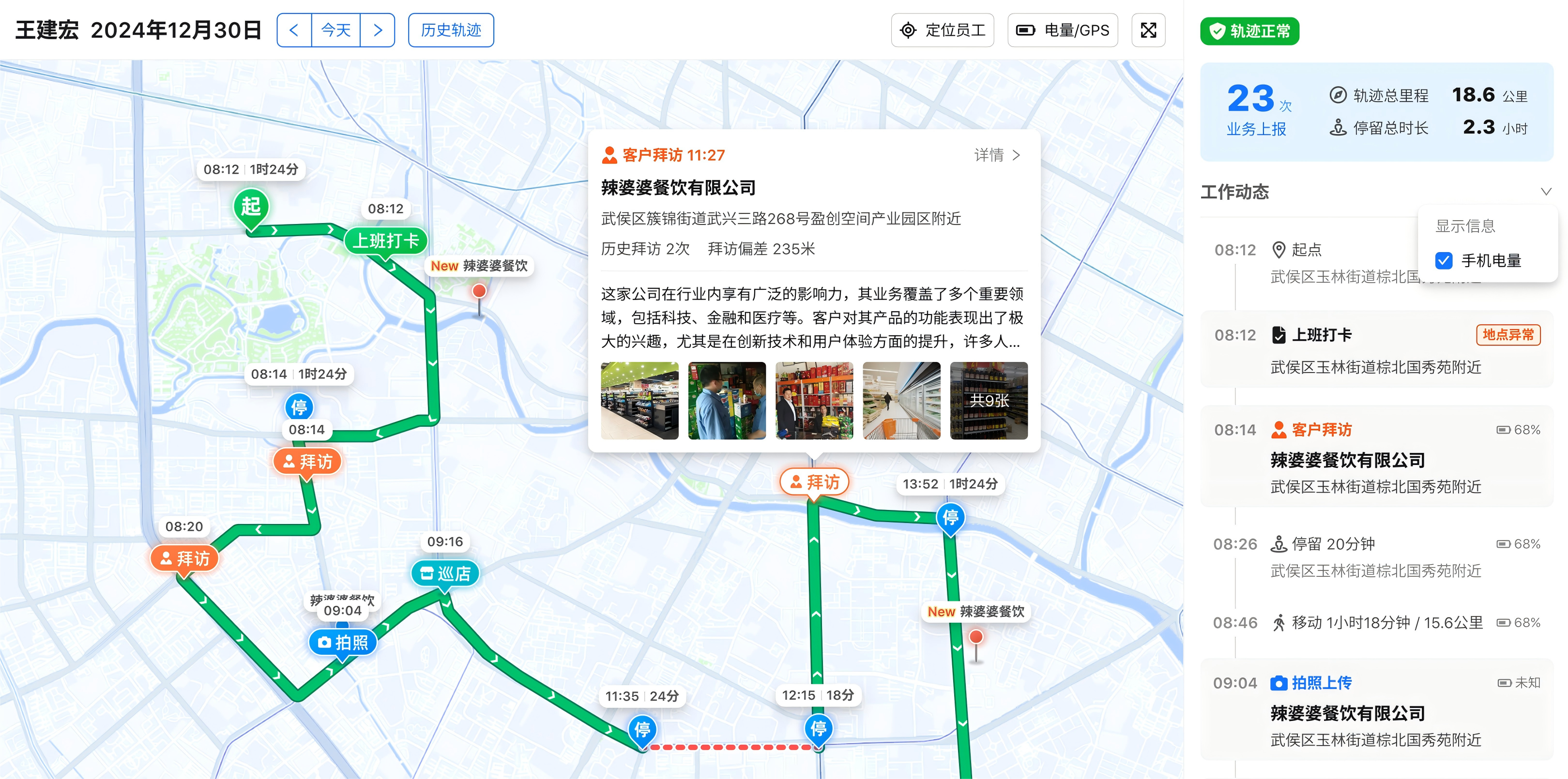 ● 小步外勤能告诉你的:他几点到的每一家、每家待了多久、拍了什么照片、填了什么拜访记录、路线是否合理、和计划对比有没有偏差。