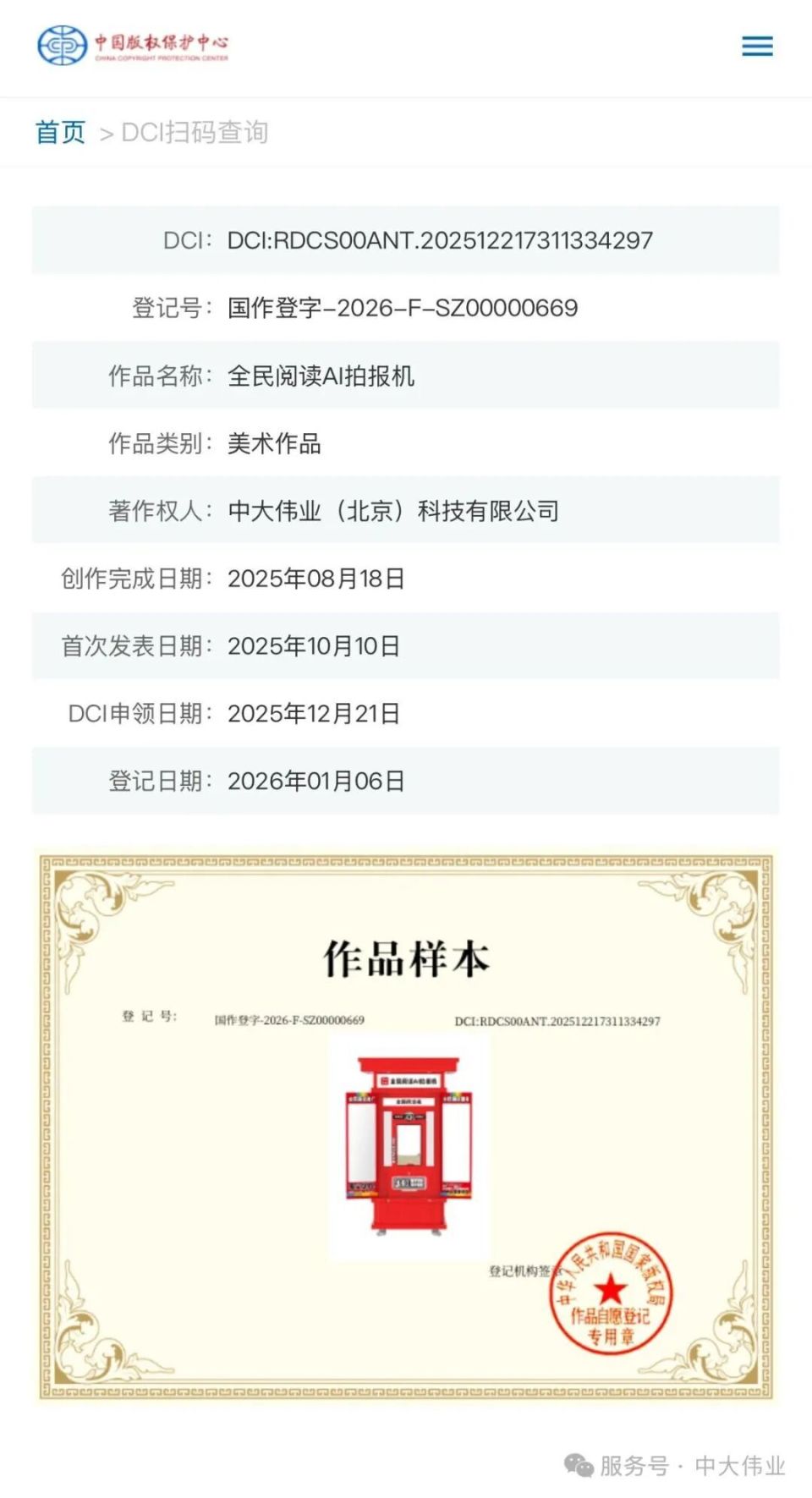 中大伟业(北京)科技有限公司AI全民阅读拍报机,以科技之力助力政府构建“智慧阅读生态”,实现社会效益与市场化可持续的完美平衡。欢迎垂询合作,共同书写“书香中国”的实践新篇!